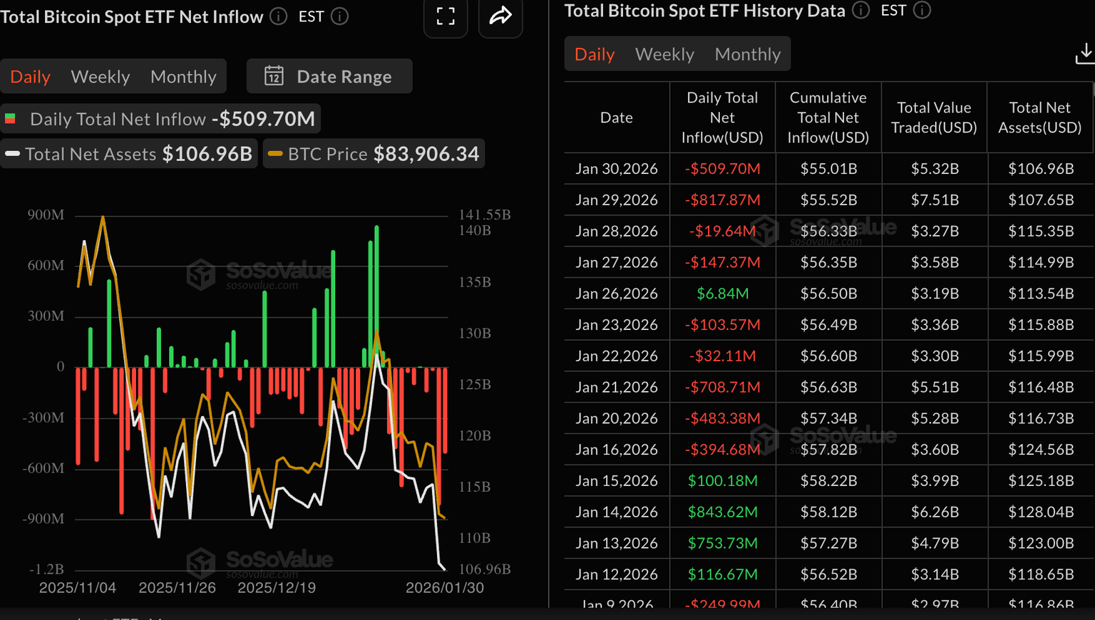 Investors continued to pull funds from Exchange-Traded Funds (ETFs), with outflows reaching approximately $510 million on Friday. SoSoValue data shows that outflows totalled $1.49 million last week, increasing from $1.33 million the previous week. The cumulative inflow stands at $55 billion with net assets under management at approximately $107 billion.