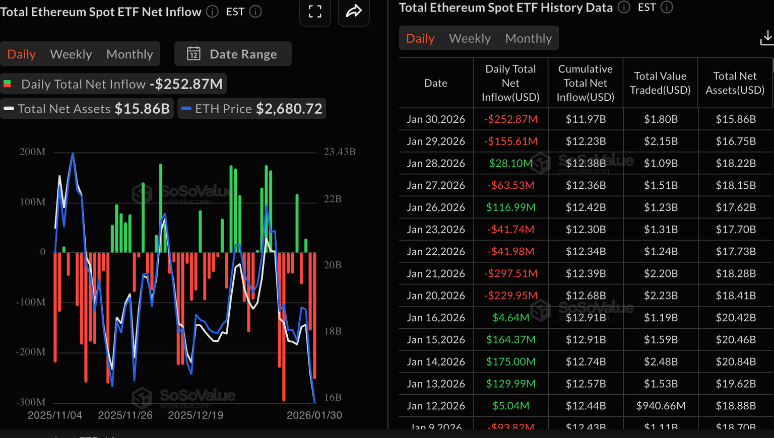 Ethereum, similarly, faces a significant drop in both institutional and retail interest, as outflows from US-listed spot ETFs rose to approximately $253 million on Friday from $156 million the previous day. The cumulative inflow stands at $11.97 billion with net assets under management at approximately $15.86 billion.