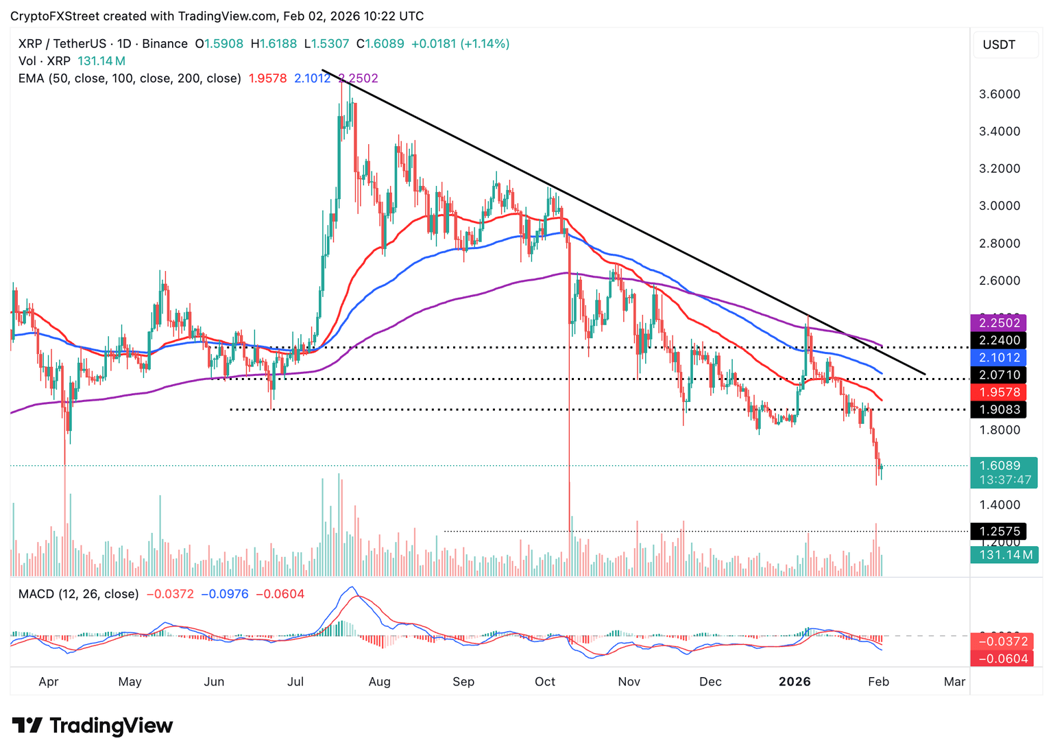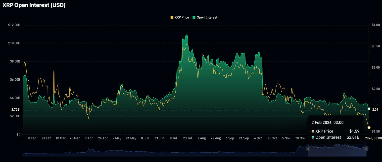 - XRP holds below its April low at $1.61 as futures Open Interest drops to $2.81 billion.