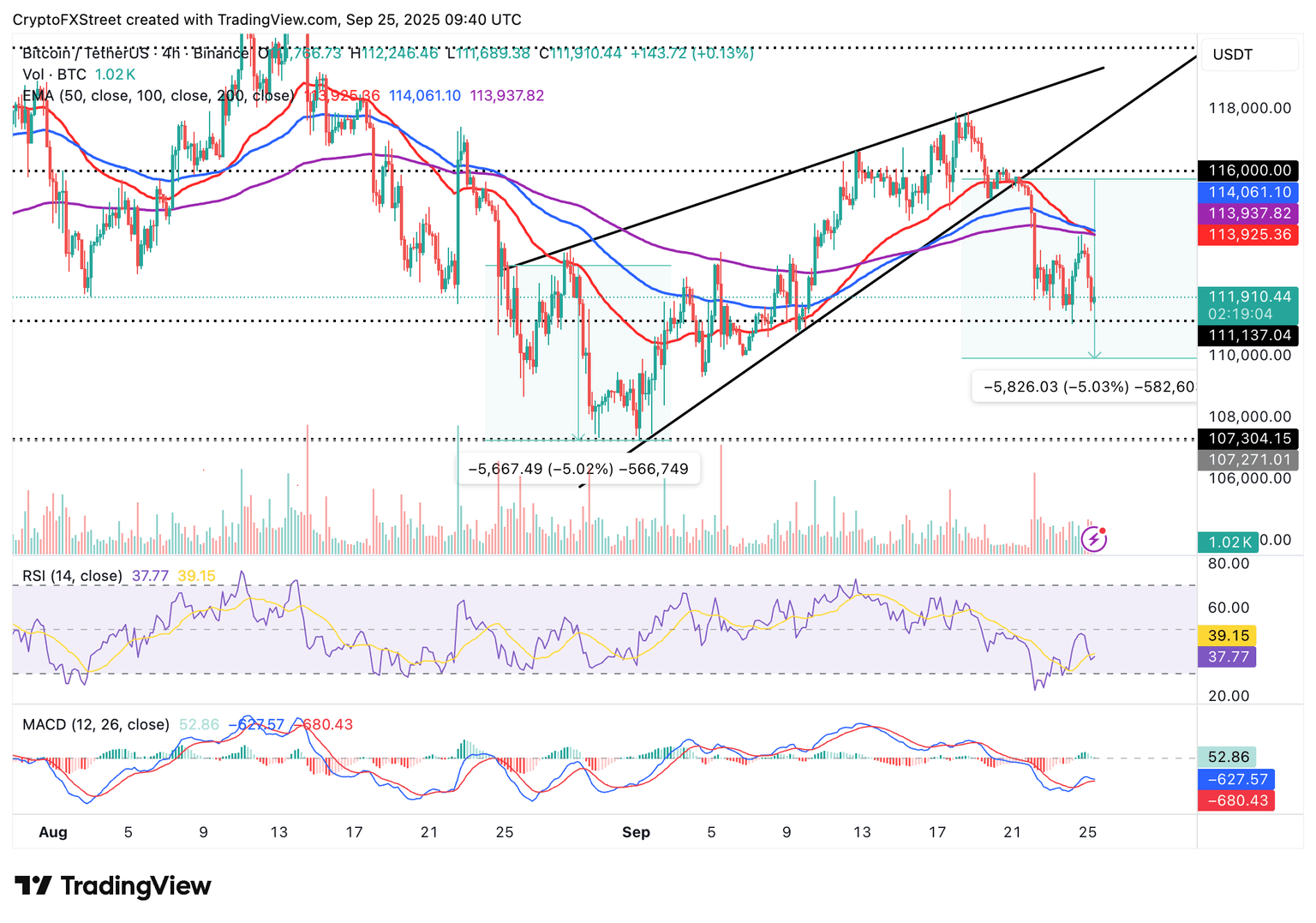 A rising wedge pattern on the same 4-hour chart projects that Bitcoin could extend the decline below the $110,000 level before regaining bullish momentum. This would result in a 5% drop below the wedge pattern, as shown on the chart below.