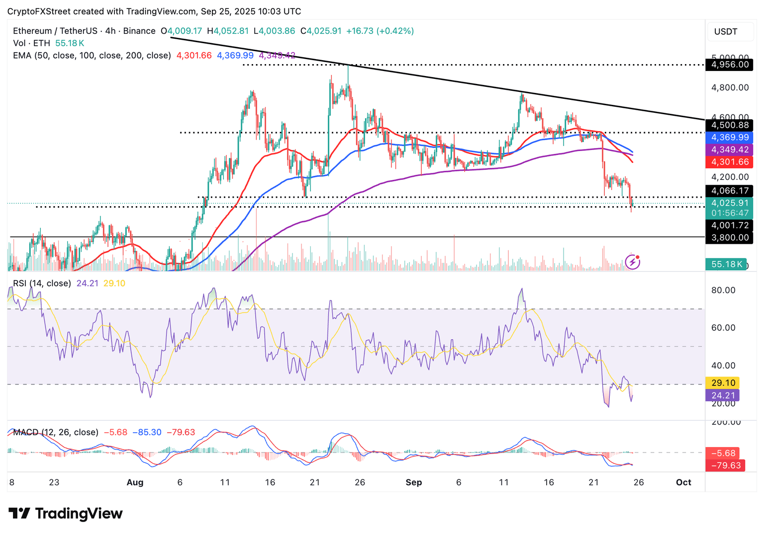 Ethereum tested the $4,000 short-term support earlier on Thursday, extending the correction from the beginning of the week. The smart contracts token also holds below key moving averages, including the 50-period, 100-period, and 200-period EMAs on the 4-hour chart, underscoring negative sentiment in the broader cryptocurrency market.