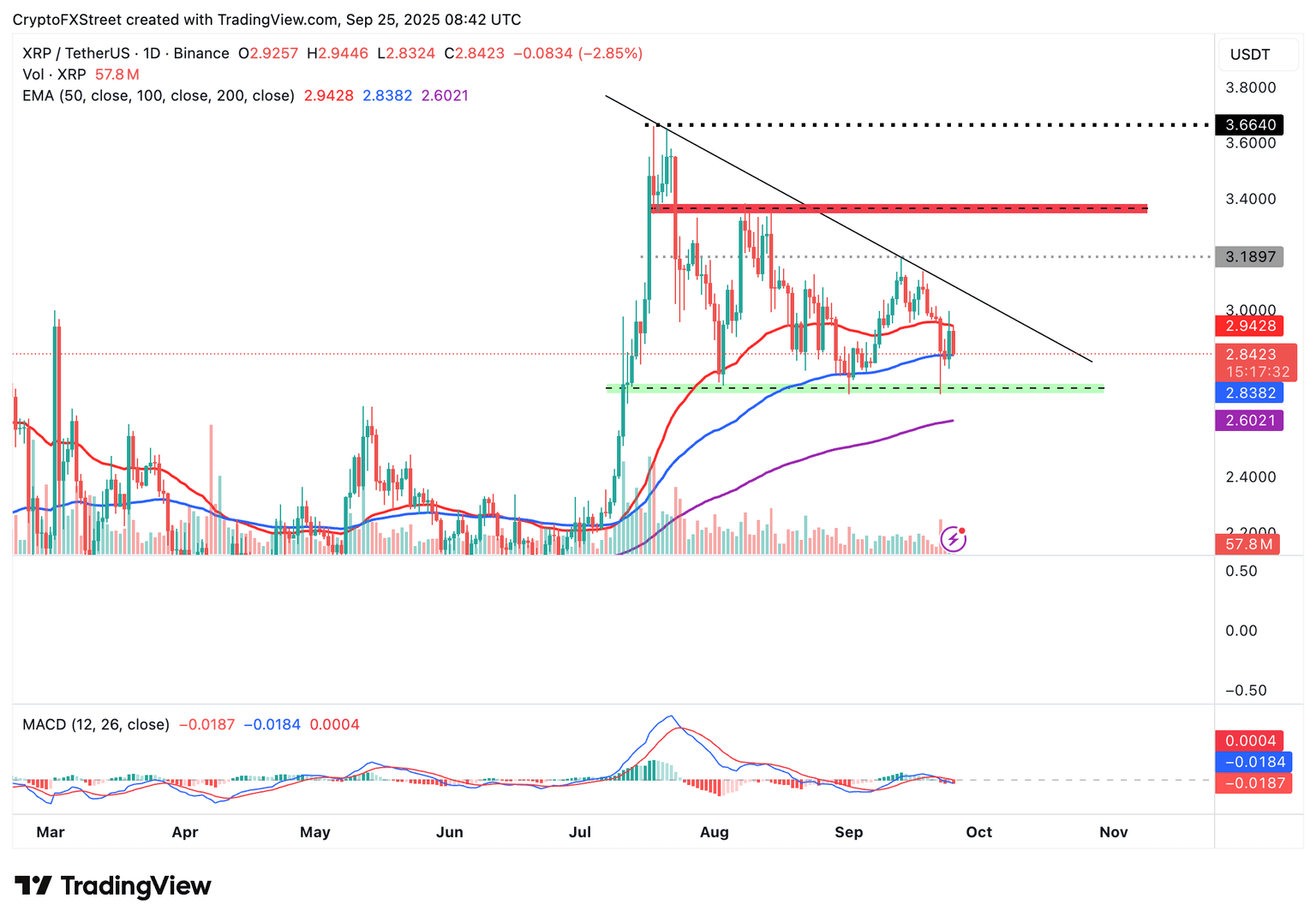 Key areas of interest for traders are the demand level at $2.70, which was previously tested on Monday, and the 200-day EMA at $2.60. On the other hand, a successful break above the 50-day EMA at $2.94 would back the trend reversal. Still, risks could remain tilted downward until the XRP price breaks the overall downtrend marked by a descending trendline since late July.