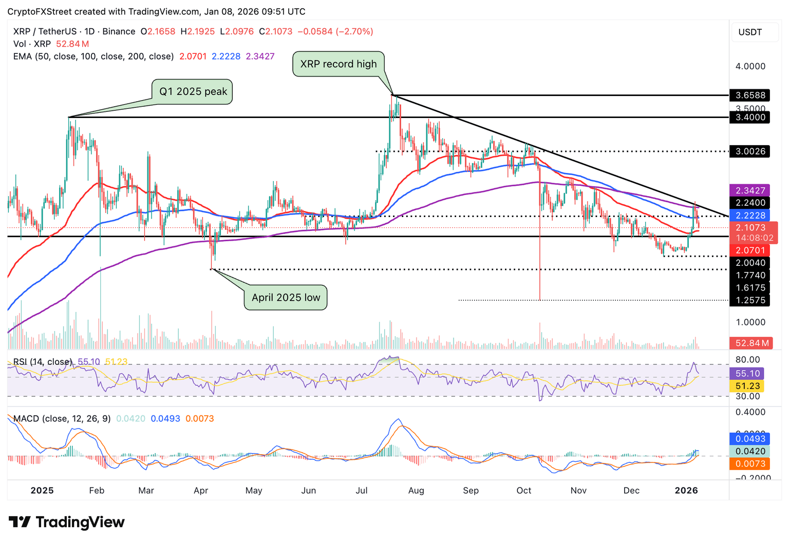 As for XRP, the price remains under pressure for the third consecutive day, trading at $2.10 at the time of writing on Thursday. The downtrending RSI at 55 on the daily chart indicates the technical structure could weaken further.