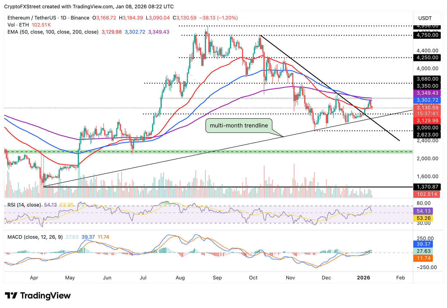 The 50-day EMA at $3,129 provides short-term support, potentially keeping Ethereum above $3,000. However, the smart contracts token remains in the woods until bulls push for a close above the moving average cluster at the 100-day EMA ($3,302) and the 200-day EMA ($3,349).