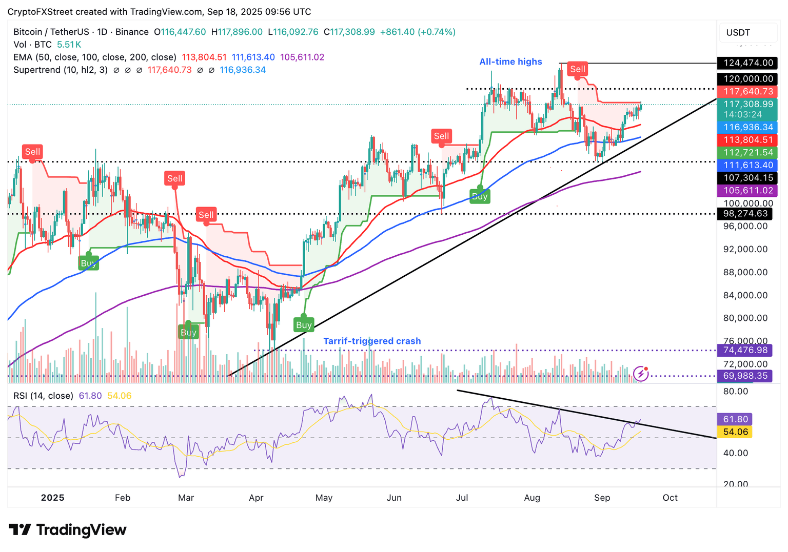 Traders will look for a buy signal from the SuperTrend indicator to ascertain BTC’s ability to sustain the uptrend, aiming at its record high of $124,474 reached on August 14.