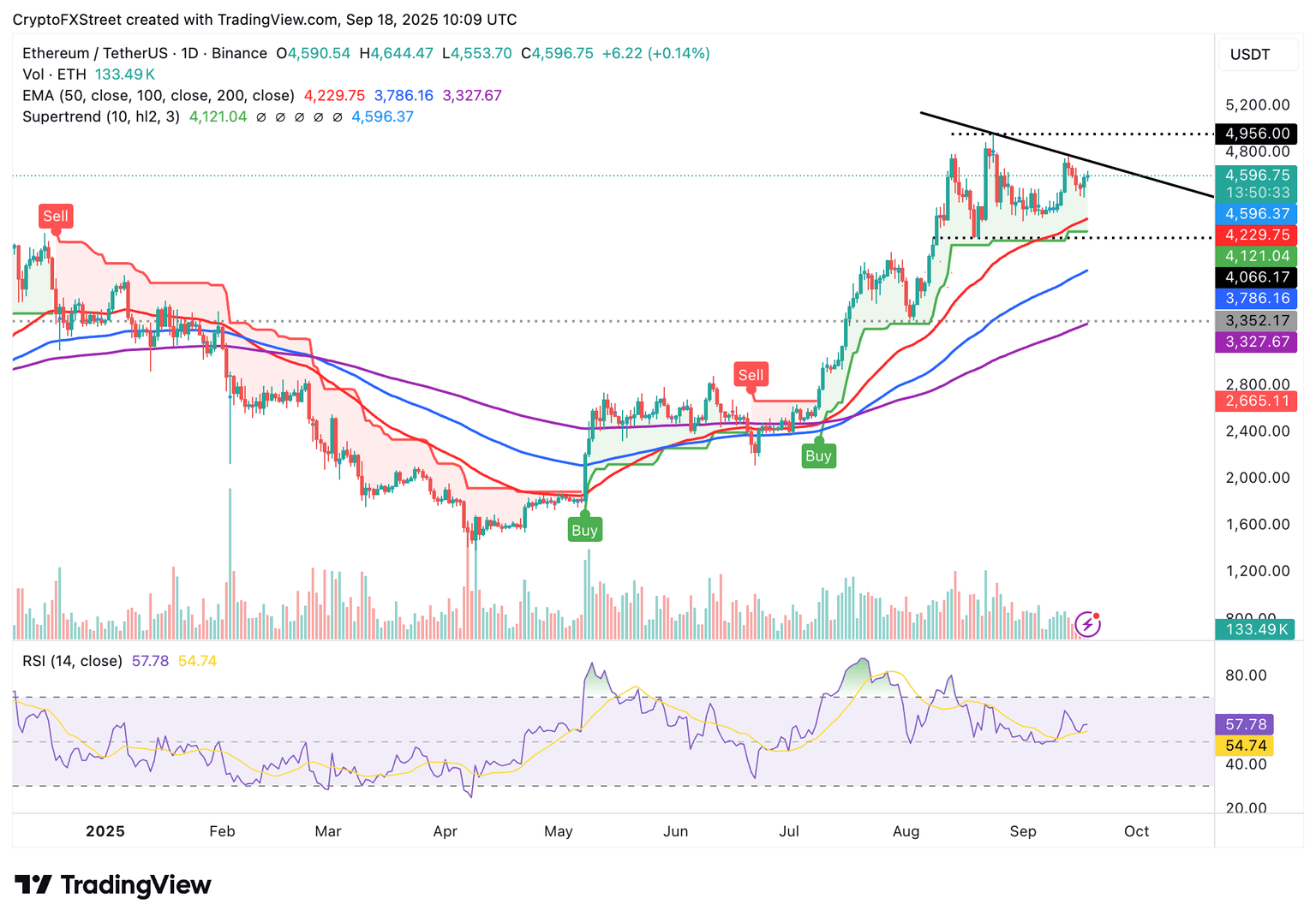 The RSI position at 57 indicates a potential extension of the leg up toward overbought territory, which could reinforce bullish momentum. A breakout above the trendline resistance and the supply areas between $4,800 and the record high of $4,956 would usher in a new era for Ethereum, potentially above the $5,000 psychological level.