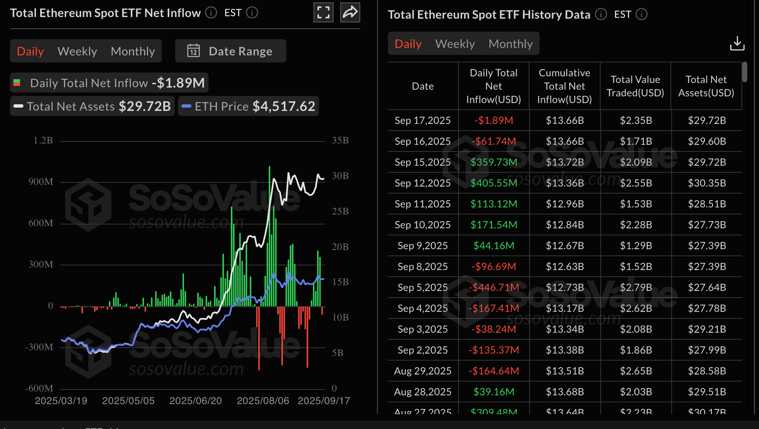 - Ethereum steadies around $4,600 despite minor ETF outflows.