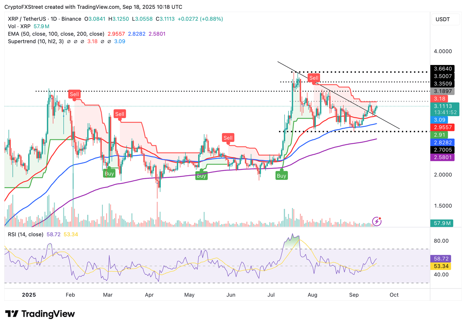 As for XRP, bulls are showing strength above the $3.00 level, with the 50-period Exponential Moving Average (EMA) at $2.95 providing additional support. A recovery of the Relative Strength Index (RSI) on the daily chart to 58 from 51 on Monday supports XRP’s short-term bullish potential.