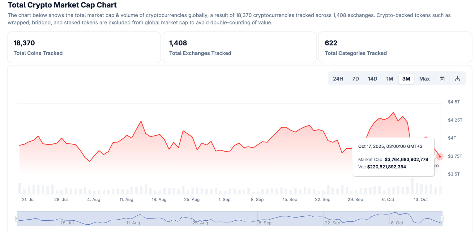 Altcoins are bearing the biggest brunt, with Ethereum (ETH) dropping to $3,700 and Ripple (XRP) sliding below a key support at $2.22. The total market capitalization is down 6% over the past 24 hours to $3.76 trillion after peaking at $4.38 trillion on October 7, according to CoinGecko.