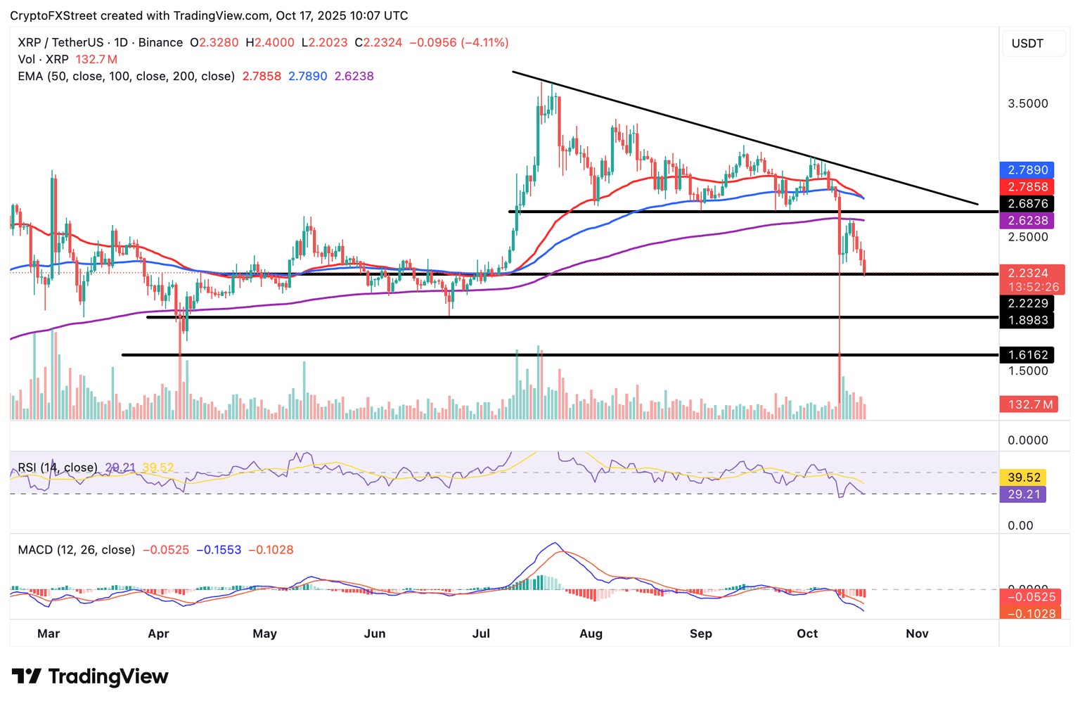 As for XRP, bears are largely in control as bulls struggle to hold support at $2.22 intact. Technical indicators lean bearishly, including a sell signal from the MACD, sustained since Thursday, and a downward-trending RSI currently in the oversold region.