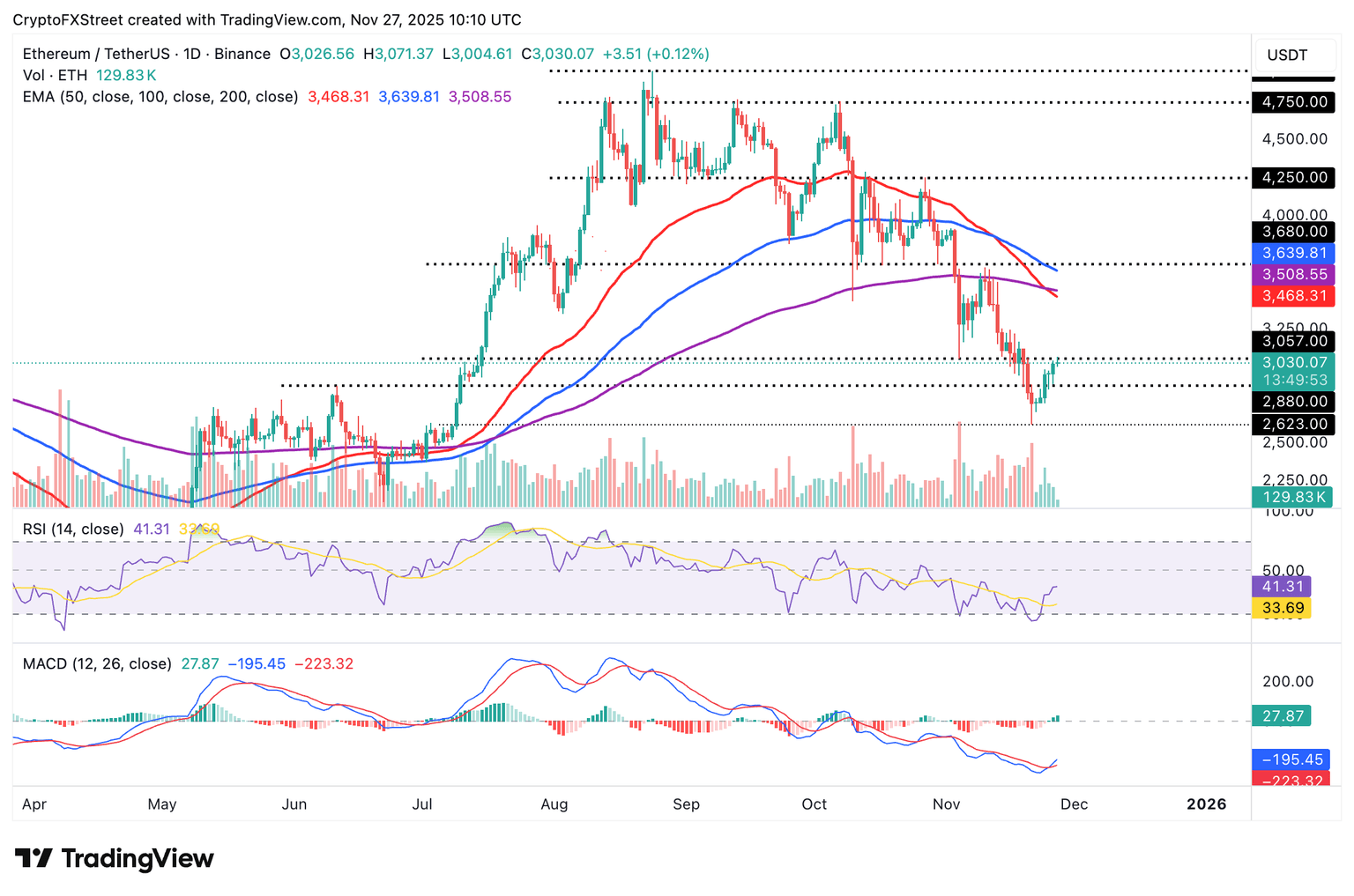 Ethereum is holding above $3,000 at the time of writing on Thursday, as bulls push to reclaim control. The RSI has risen to 41 from the oversold region on the daily chart, indicating that bearish momentum is narrowing and that ETH bulls could push toward the 50-day EMA at $3,468.