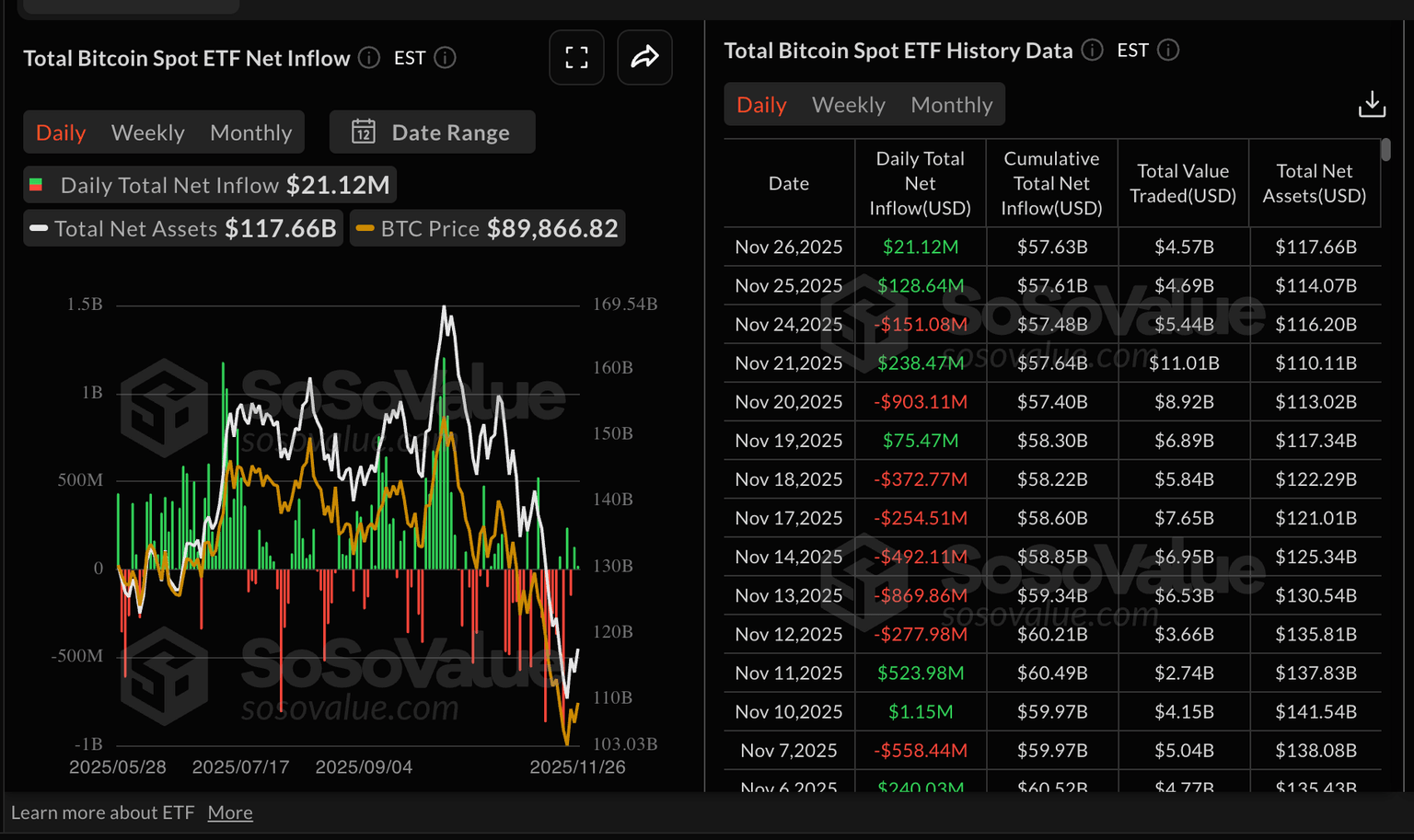 Bitcoin ETFs listed in the United States (US) experienced inflows on Wednesday, reflecting improving risk appetite among institutional investors. SoSoValue data shows that Bitcoin recorded mild ETF inflows, totaling $21 million on Wednesday, pointing to a subtle return of institutional investors.
