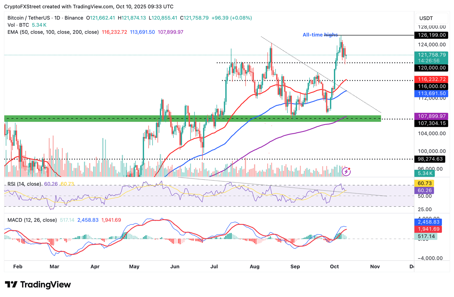 Key levels of interest for traders are the 50-day Exponential Moving Average (EMA) at $116,232, the 100-day EMA at $113,691, and the record high of $126,199 if investors buy the current dip, pushing the BTC price higher.