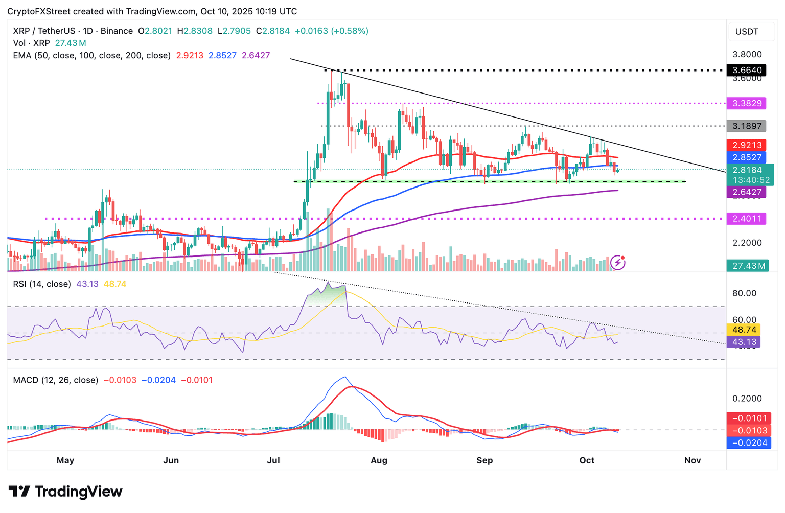 As for XRP, bulls are paring intraday losses following the correction on Thursday to $2.76. The cross-border money remittance token is trading at $2.81 at the time of writing on Friday, as buyers attempt to recoup losses.