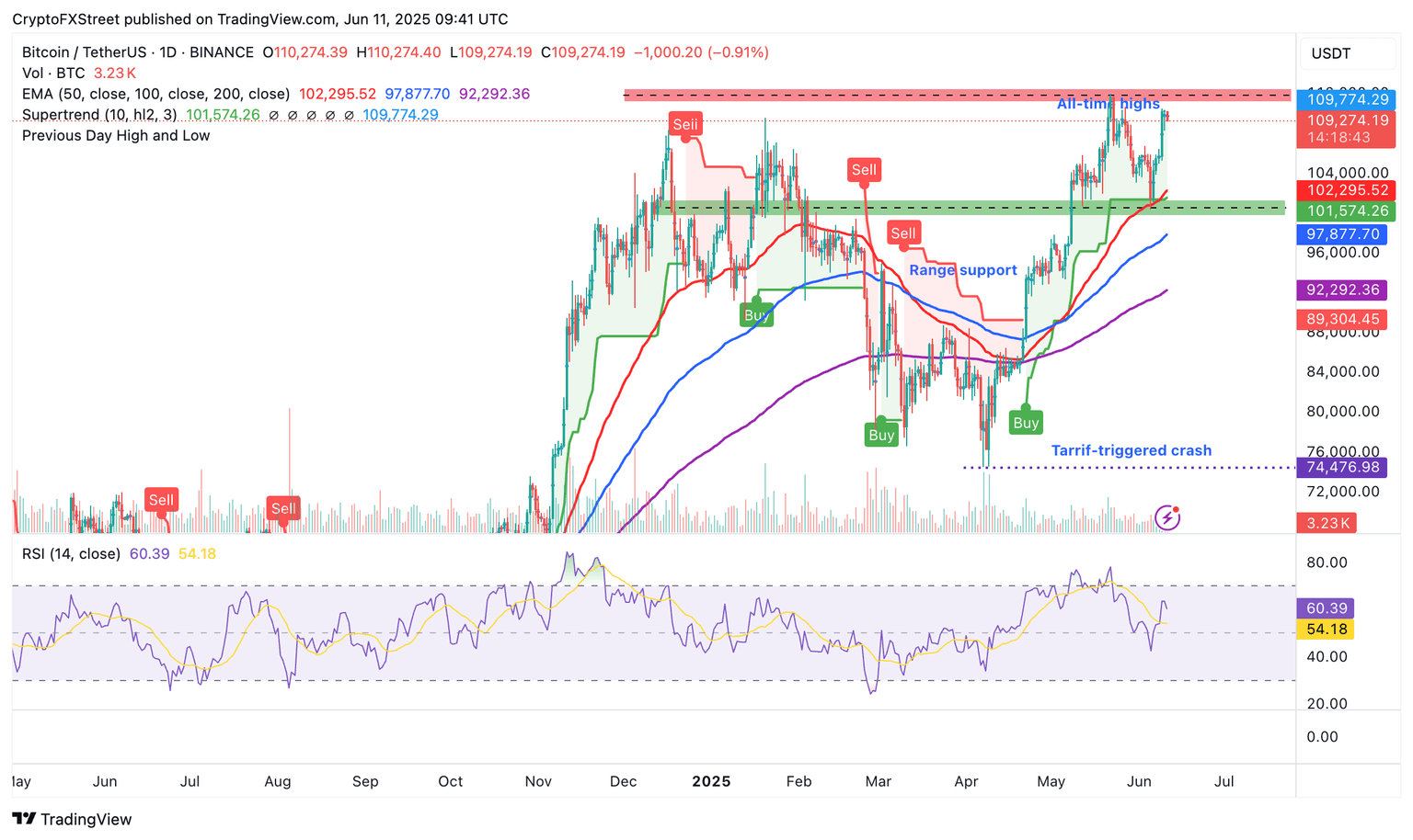 The cryptocurrency market is generally holding onto most of the gains accrued during the euphoric rally on Monday, when Bitcoin (BTC) cracked the resistance at $111,000 to post weekly highs at around $110,516. Meanwhile, the largest digital asset by market capitalization hovers at $109,274 at the time of writing on Wednesday, down over 0.5% on the day as investors digest the aftermath of the trade talks between the United States (US) and China.