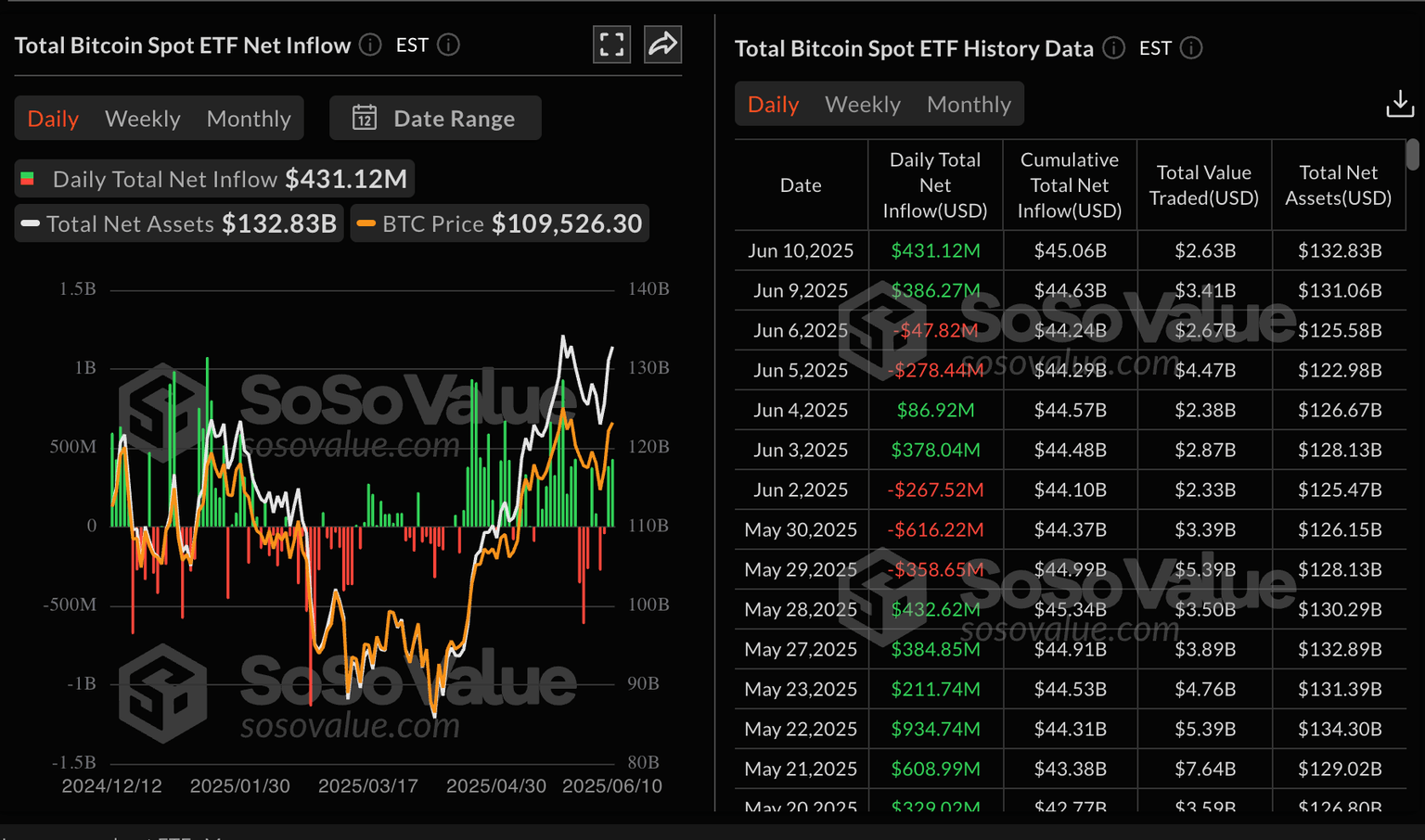 Optimism for a trade deal between the US and China reignited interest in risk assets, with Bitcoin spot Exchange Traded Funds (ETFs) experiencing inflows resuming on Monday after two consecutive days of net outflows. SoSoValue data highlights that BTC spot ETFs posted approximately $431 million in net inflows on Tuesday, up from $386 million seen on Monday.