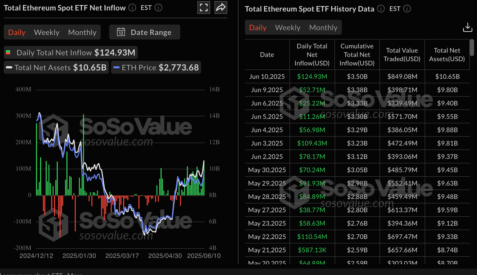 The largest smart contacts token, Ethereum, has maintained a positive streak over the last 16 days, with spot ETFs recording net inflows. The total daily net inflow on Tuesday surged to $124, the highest level since May 21.