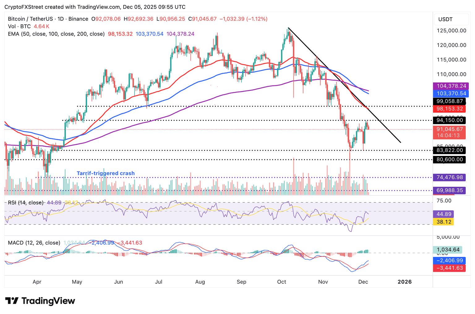 Bitcoin (BTC) is steadying above $91,000 at the time of writing on Friday. Resistance at $94,150 capped recovery on Wednesday, but in the meantime, bulls have contained downside risks above $90,000.