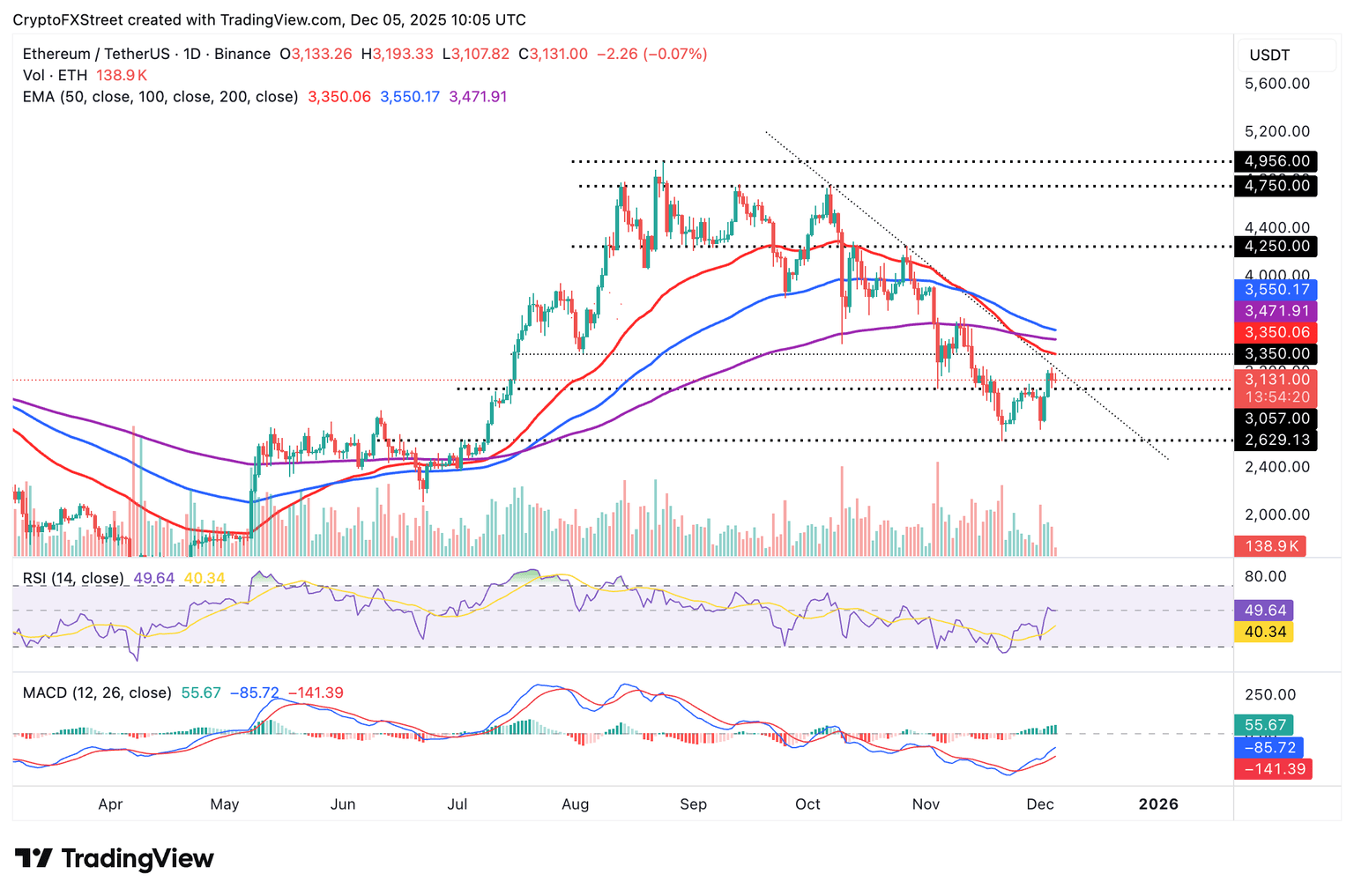 Still, the MACD is rising toward the mean line and has maintained a buy signal since November 25. Green histogram bars are expanding above the mean line, indicating increasing bullish momentum. A break above the descending trendline would reinforce the bullish thesis for a breakout toward $4,000.