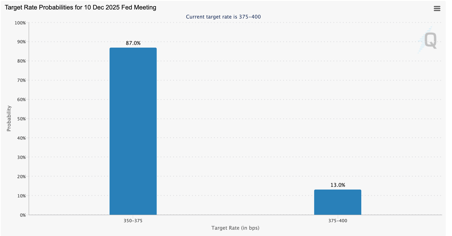 The next Fed interest rate decision is expected on December 10, and markets, including crypto, are pricing in an 87% probability of a 25-basis-point cut from 3.75–4.00% to 3.50–3.75%.