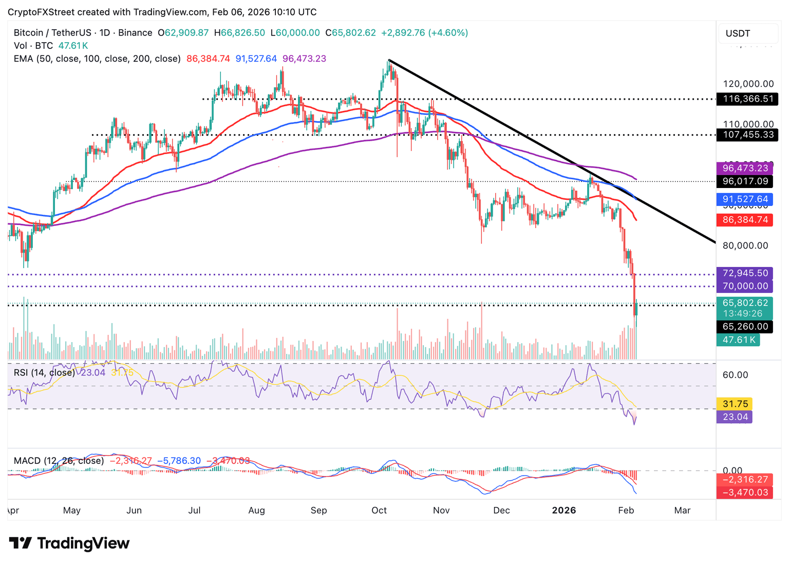 Bitcoin has bounced from the $60,000 intraday low and is currently trading above $65,000 at the time of writing on Friday. The Relative Strength Index (RSI) at 23 on the daily chart points upward, suggesting bearish momentum may be easing, opening the door to an extended rebound.