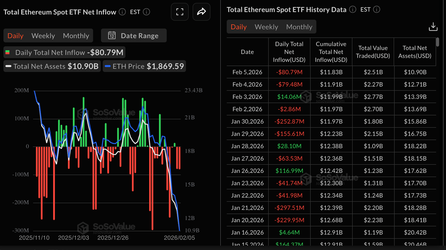 Ethereum, on the other hand, saw increased outflows from spot Exchange-Traded Funds (ETFs). According to SoSoValue data, institutional investors withdrew nearly $81 million on Thursday, marking the second consecutive day of outflows. As a result, cumulative inflows have declined to $11.83 billion, while net assets under management stand at $10.9 billion.