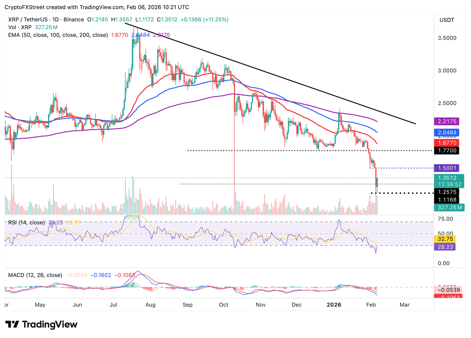 As for XRP, bulls continue to push the price above $1.35, supported by the RSI, which is rising to 28 in oversold territory. This knee-jerk recovery follows an intraday low tested at $1.12, relieving battered traders from losses incurred during Thursday’s aggressive sell-off from $1.51.