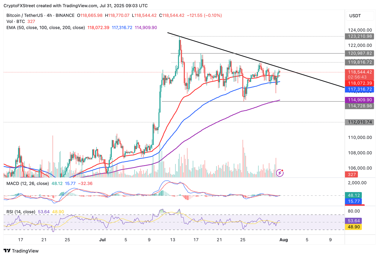 Bitcoin price is trading above several key support levels, including the buyer congestion at $115,792, which was tested on Wednesday, the 100-period Exponential Moving Average (EMA) at $117,316, and the 50-period EMA at $118,072, reclaimed on the 4-hour chart.