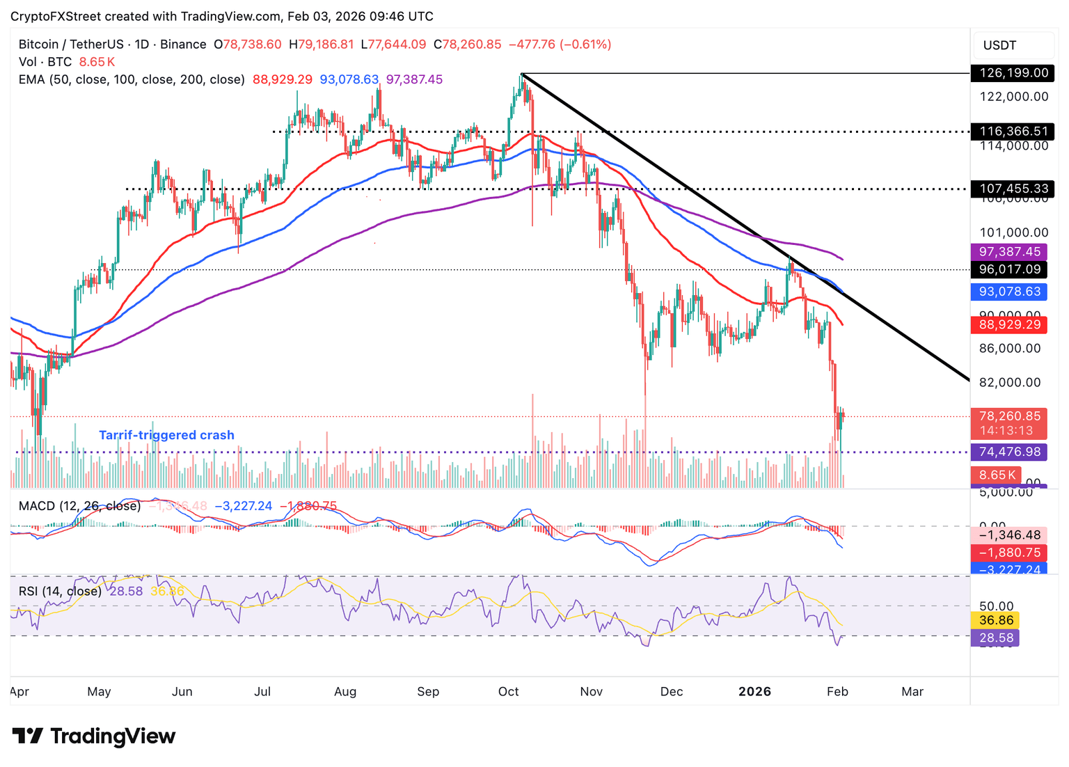 Bitcoin remains above support at $78,000, trading under pressure and significantly below downward-trending moving averages, which adds to the overall bearish outlook. The 50-day Exponential Moving Average (EMA) at $88,929, the 100-day EMA at $93,078 and the 200-day EMA at $97,387 slope downward as headwinds intensify.