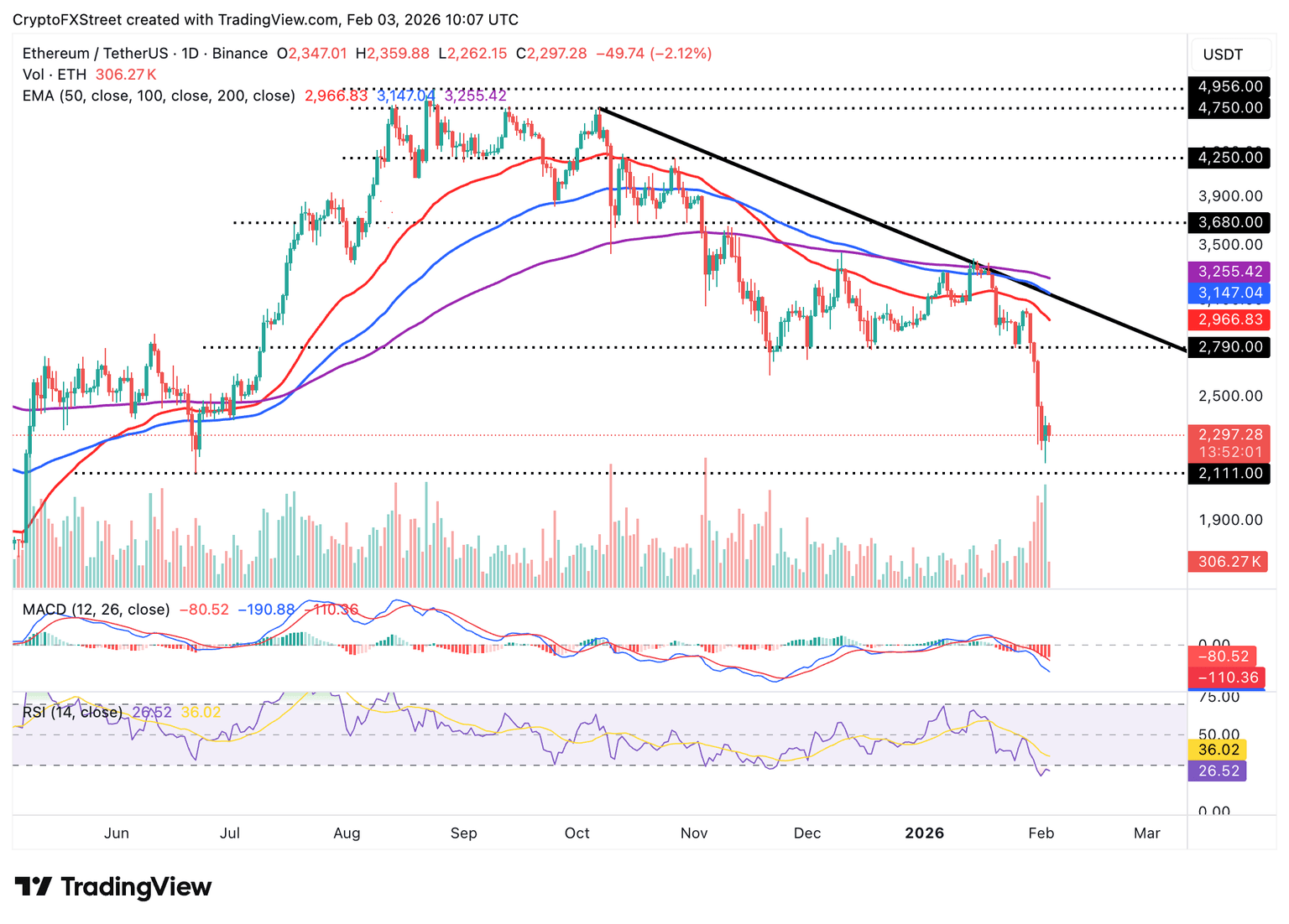 The RSI at 26.5 on the same chart is oversold, signaling intense bearish momentum, but it also suggests that seller exhaustion may result in a knee-jerk recovery toward Sunday’s high at $2,476. For now, the path with the least resistance remains downward, with ETH eyeing Monday’s low at $2,157.