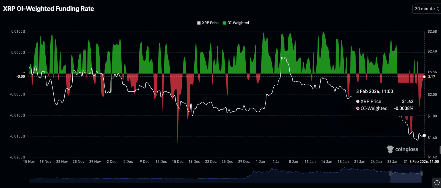 The retail market remains cautious, with traders closing positions rather than opening new ones. CoinGlass data shows the XRP Open Interest (OI) Weighted Funding Rate is still in the negative at -0.0008% on Tuesday, up from -0.0080% the previous day.