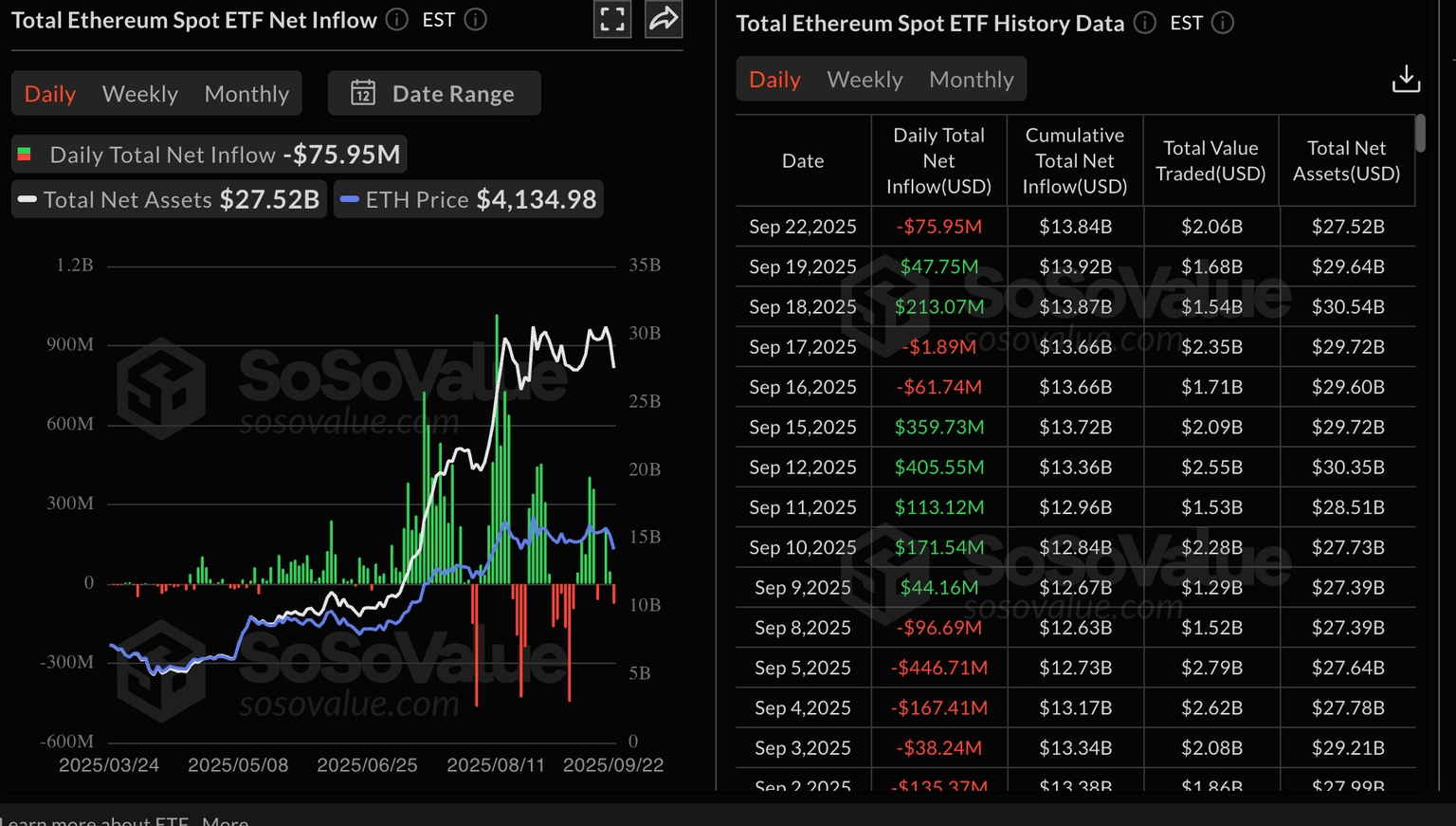 Similarly, Ethereum ETFs in the US experienced net outflows totaling $76 million, marking the end of two consecutive days of inflows. The price of Ethereum also corrected by 5.5% on Monday to close at around $4,200, reflecting risk-off sentiment amid fears of an extended decline below the $4,000 level.