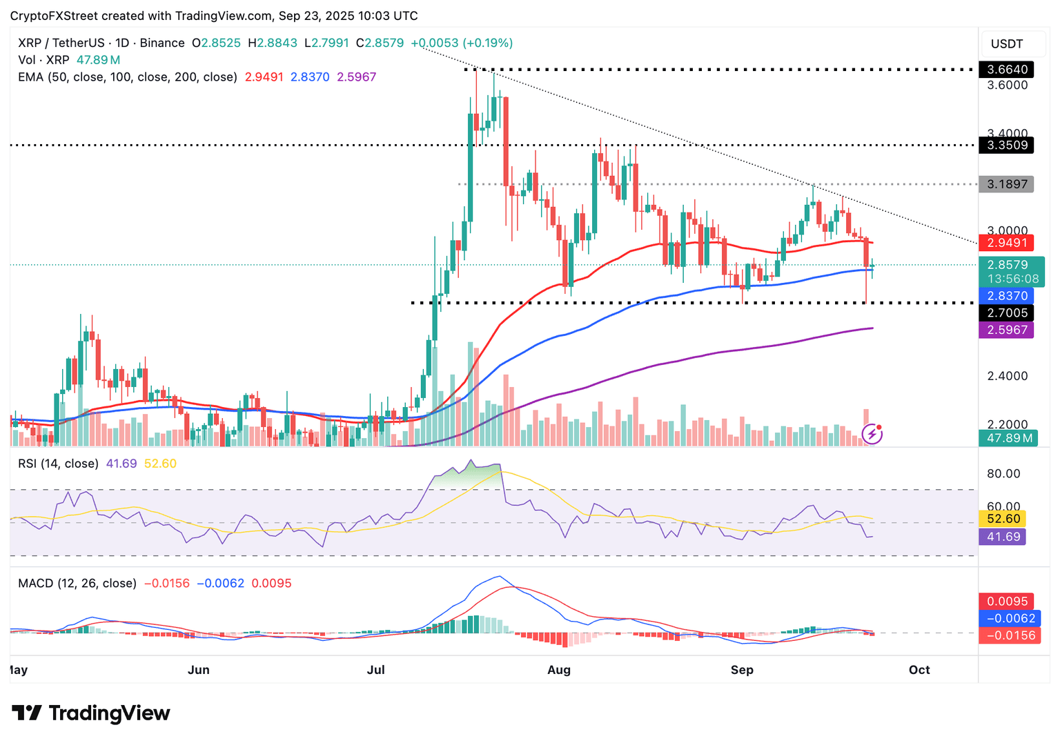 - XRP remains above the 100-day EMA, but a descending trendline highlights a general downtrend from its record high.