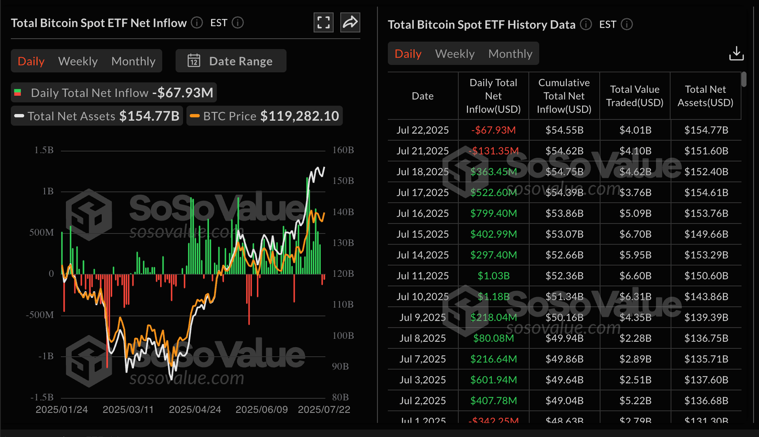 - Bitcoin extends its decline toward $118,000, a key short-term support level, as BTC spot ETFs mark second consecutive day of outflows.