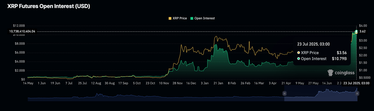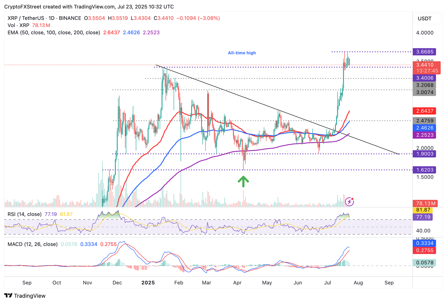 The same bullish outlook is reflected in the XRP derivatives market, where the futures OI has surged to new record highs, reaching $10.79 billion at the time of writing. XRP price hit a new all-time high of $3.66 on Friday before correcting to $3.44 at the time of writing. The decline could be a sweep through liquidity before the next attempt at breaking out to a new record high.