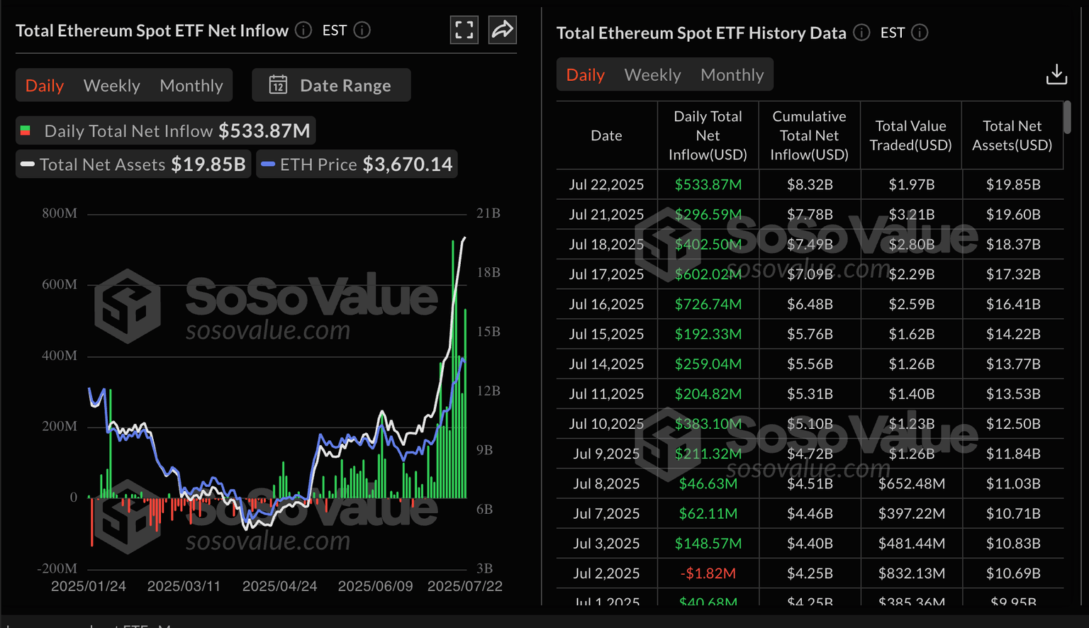 Ethereum currently boasts $8.32 billion in cumulative net inflows with net assets averaging $19.85 million.