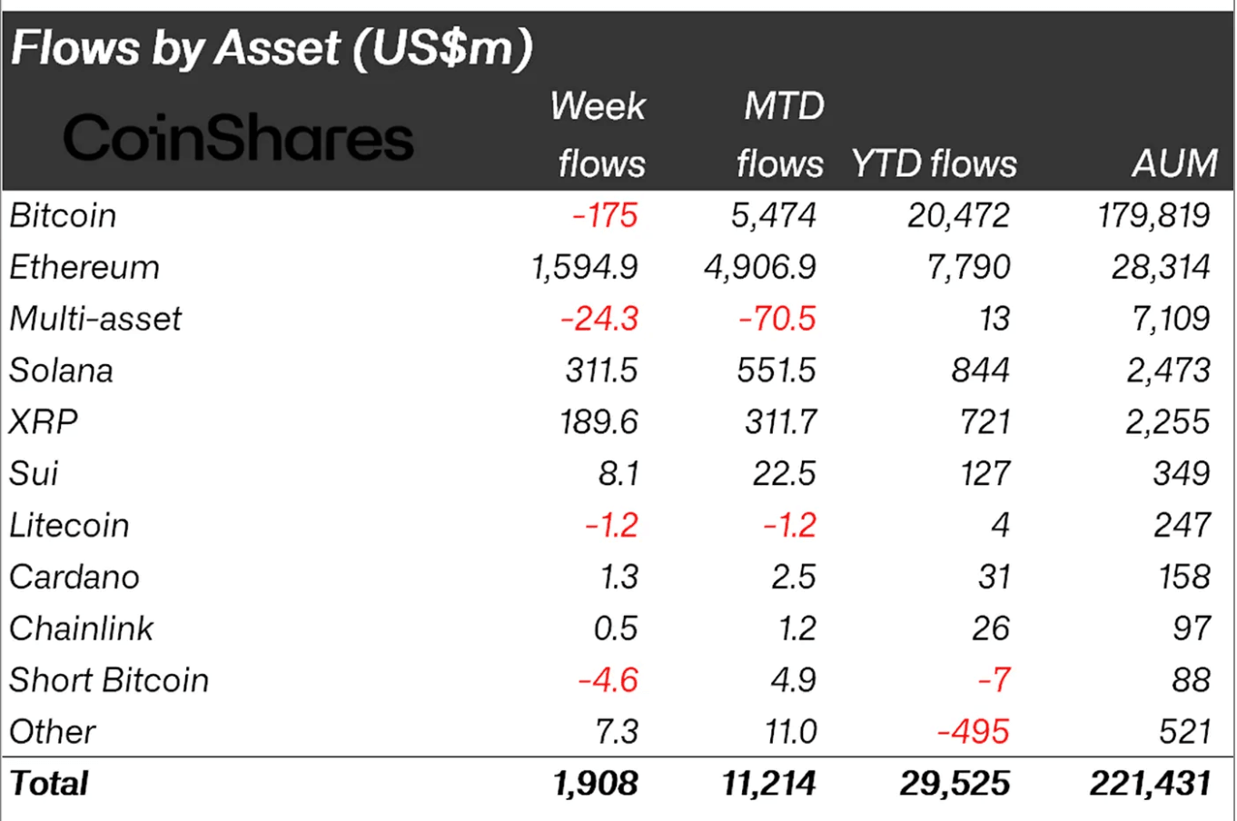 Digital asset investment products recorded total inflows of $1.9 billion last week, according to a CoinShares report. Ethereum dominated capital inflows with $1.59 billion, its second-largest week in history.