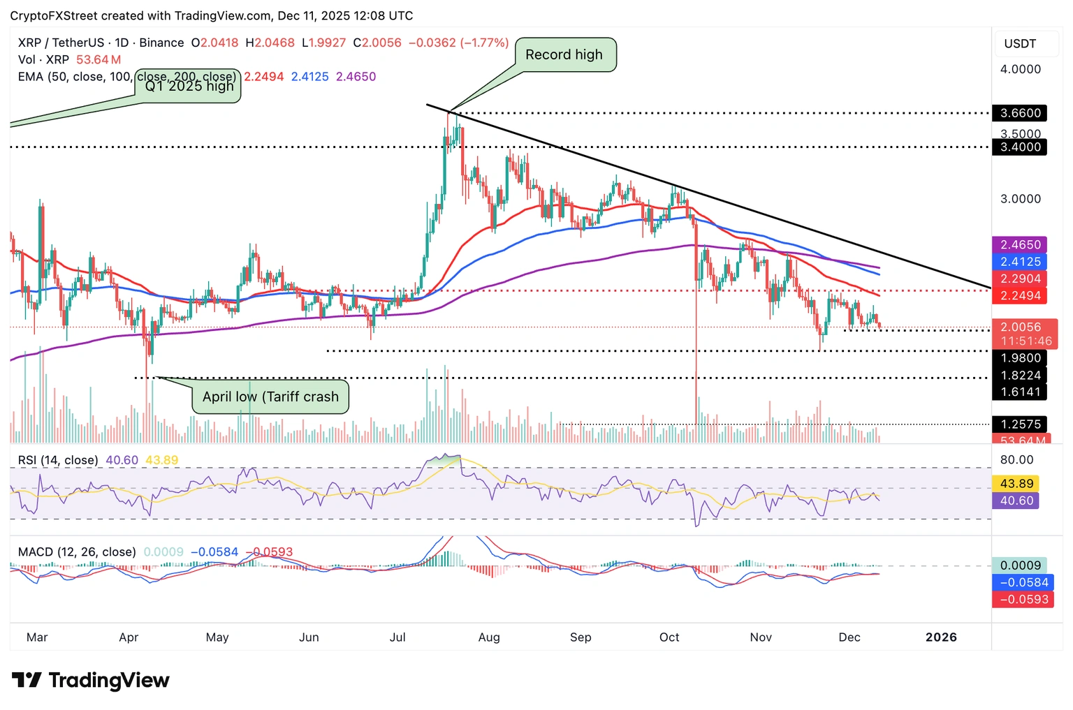 - XRP holds $2.00 short-term support amid a weak but stable derivatives market.