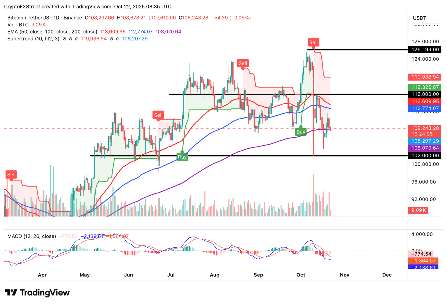 The Moving Average Convergence Divergence (MACD) and the SuperTrend indicators highlight a bearish technical structure, increasing the odds of extending the decline toward BTC’s October lows of $102,000.