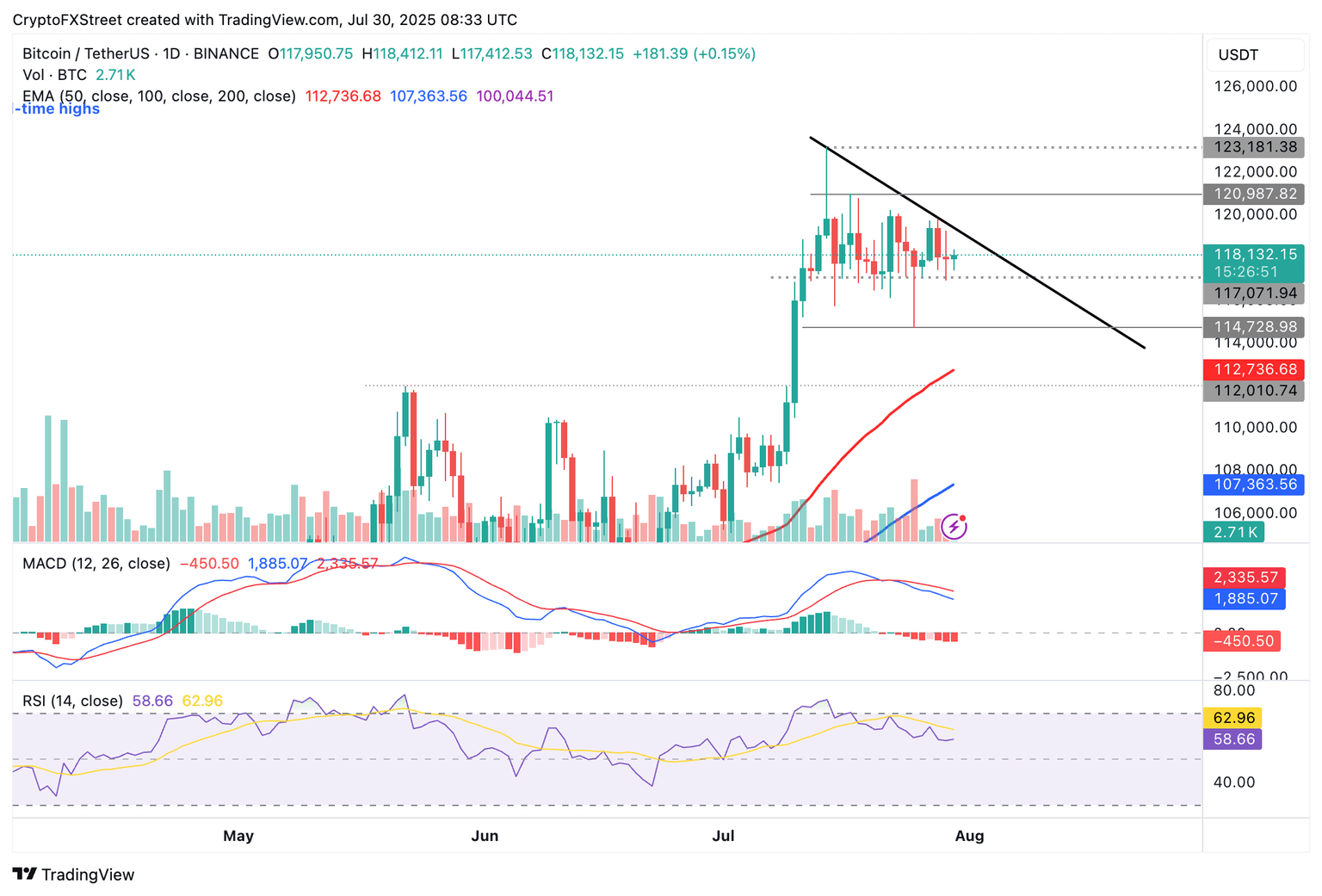 If macroeconomic uncertainty creates instability, traders could consider reducing exposure, which will contribute to the selling pressure. Hence, another sweep for liquidity in lower support zones such as $116,000 and the 50-day Exponential Moving Average (EMA) currently at $112,736 cannot be shrugged off immediately.