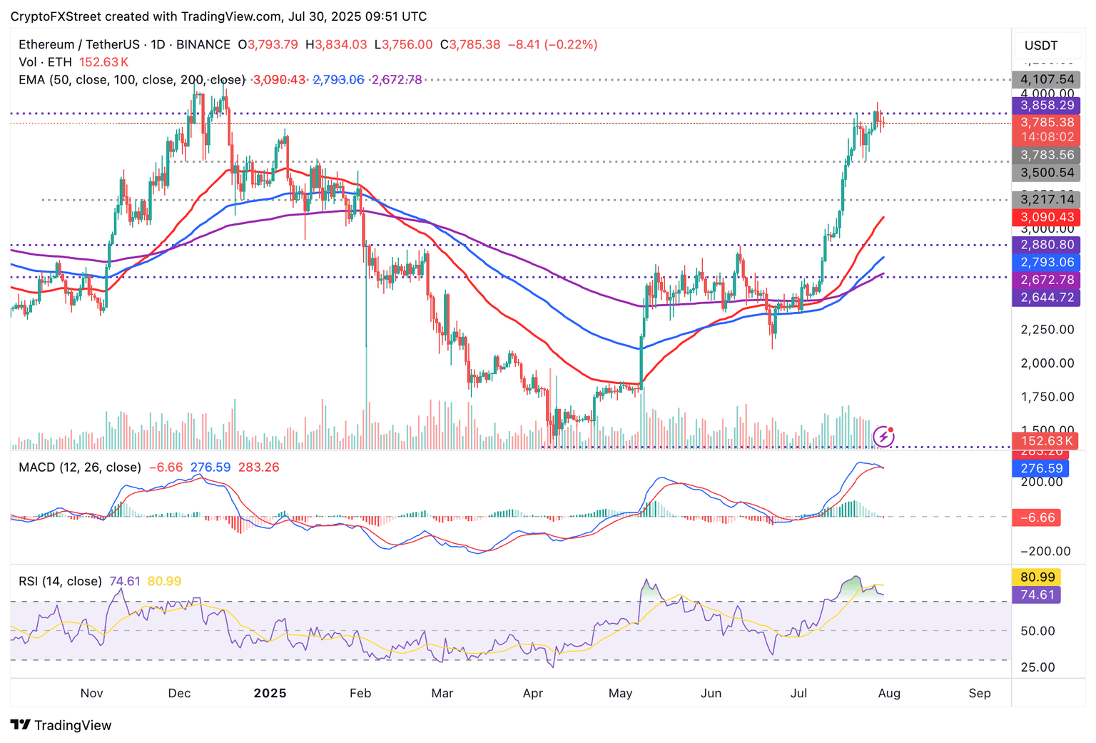 Ethereum price rally near the $4,000 milestone was primarily driven by institutional demand and an increase in retail interest. Elevated spot volumes, futures Open Interest (OI), and funding rates continue to bolster the token's upside, which has been sideways around the $3,800 level.