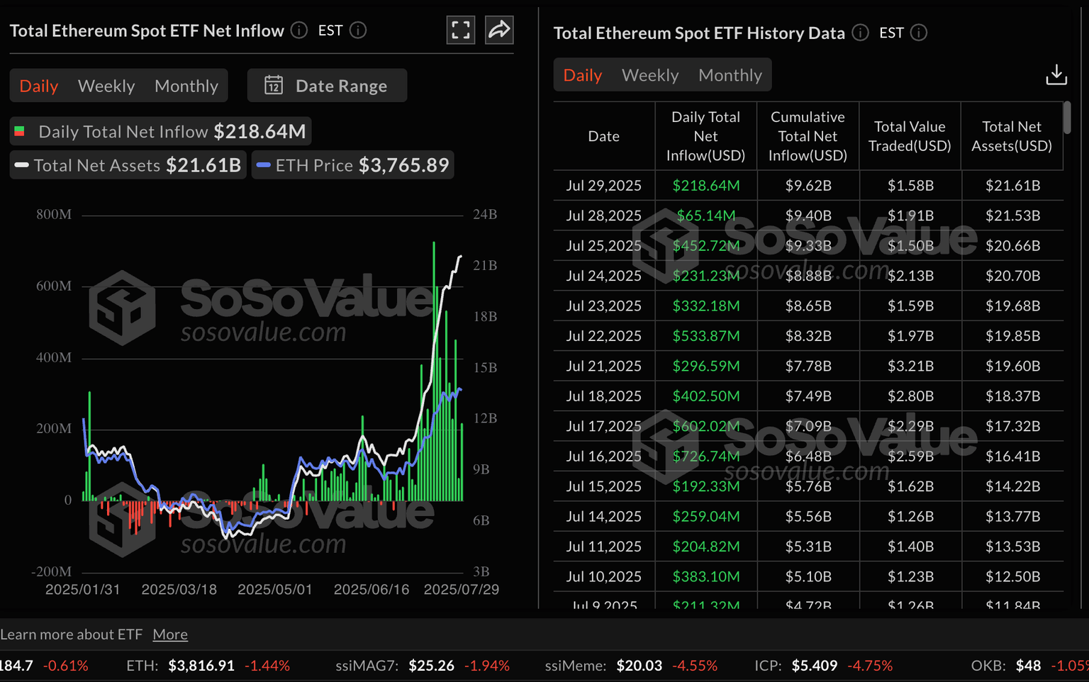 Meanwhile, US ETH spot ETFs attracted a net inflow of around $219 million on Tuesday, continuing the unbroken bullish streak since July 2. The cumulative total inflow currently stands at $9.62 billion, with net assets averaging around $21.61 billion.