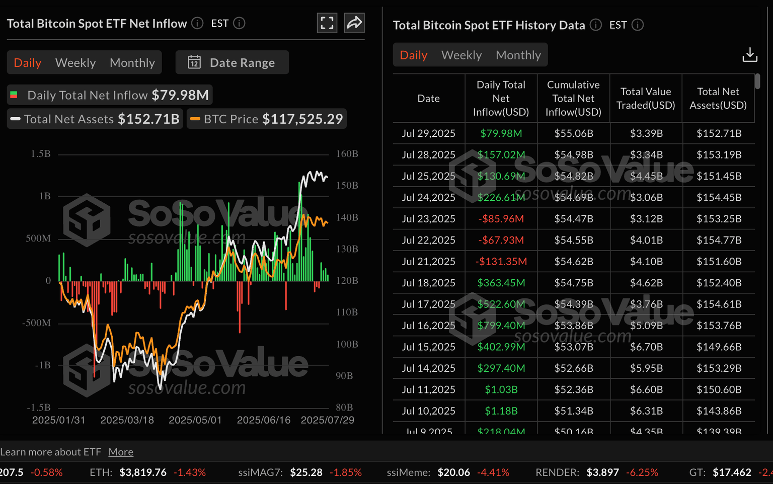 The demand for US BTC spot ETFs has significantly reduced over the last week, compared to mid-July when Bitcoin price rallied, reaching a new record high of $123,218. Despite the decline in volume, there have been four consecutive days of inflows, with approximately $80 million recorded on Tuesday. The cumulative total net inflow stands at $55 billion, with net assets averaging around $153 billion.