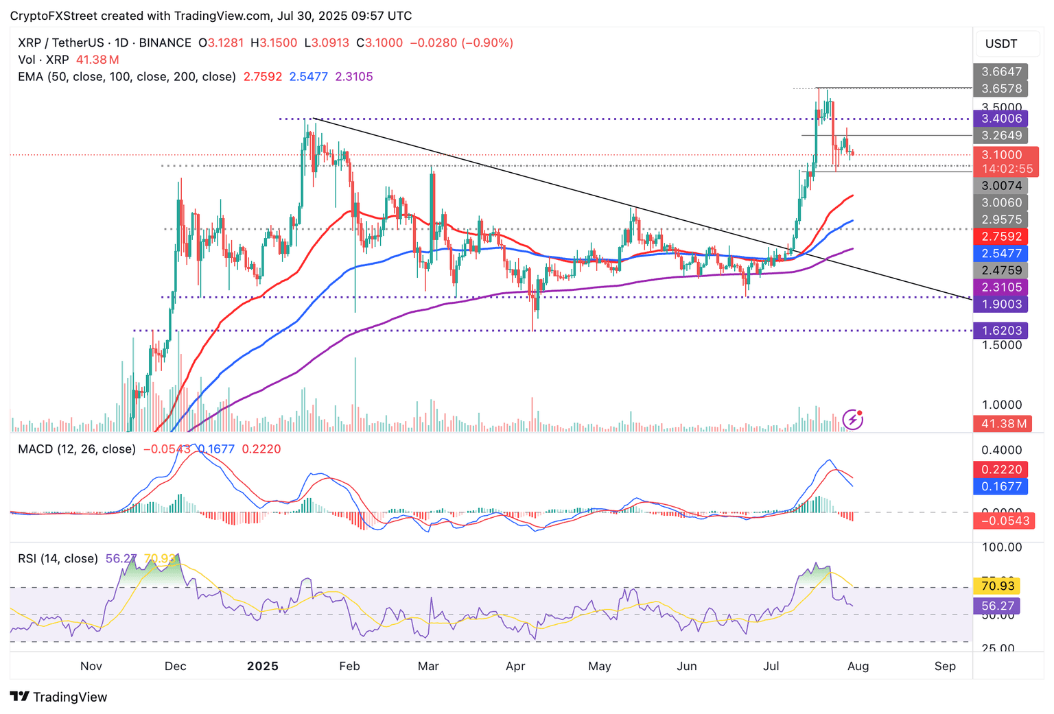 As for XRP, sellers appear to be regaining control, backed by a sell signal from the MACD indicator and the RSI declining at 56 after peaking around 88 during the run-up to the all-time high of $3.66, reached on July 18.