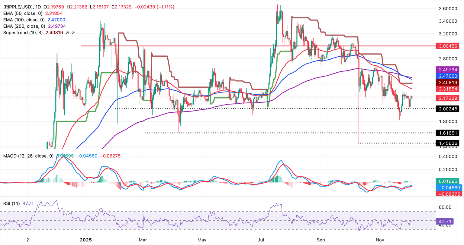 Meanwhile, XRP is trading well below the descending 50-day EMA at $2.31, 100-day EMA at $2.47 the 200-day EMA at $2.49, underscoring a bearish bias. The MACD indicator's histogram bars are mildly positive on the daily chart, with the blue line marginally above the red signal line, hinting at tentative momentum repair.