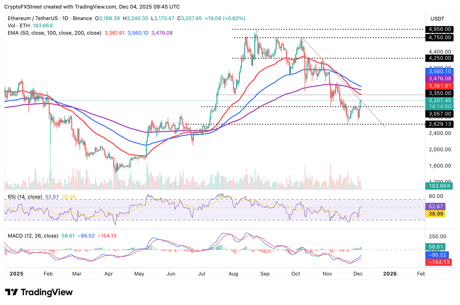 Still, the smart contracts token also sits below the 50-day EMA at $3,361, the 200-day EMA at $3,476, and the 100-day EMA at $3,560, which underpin a bearish trend. A reversal below the $3,000 total support is still on the cards unless Ethereum flips the 50-day EMA into support.