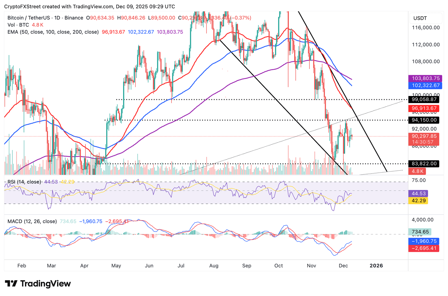 Bitcoin is trading above $90,000 at the time of writing on Tuesday, as buyers and sellers battle for control. Bitcoin's position below the declining 50-day Exponential Moving Average (EMA) at $96,913, the 100-day EMA at $102,322 and the 200-day EMA at $103,803, undermines its bullish potential.