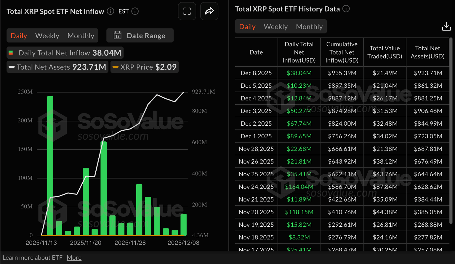 XRP ETFs extended their steady positive streak with inflows totalling $38 million on Monday. Since their debut on November 13, XRP ETFs have not posted outflows, signaling growing institutional interest in altcoin-related crypto investment products. The cumulative inflow averages $935 million with net assets of $924 million.