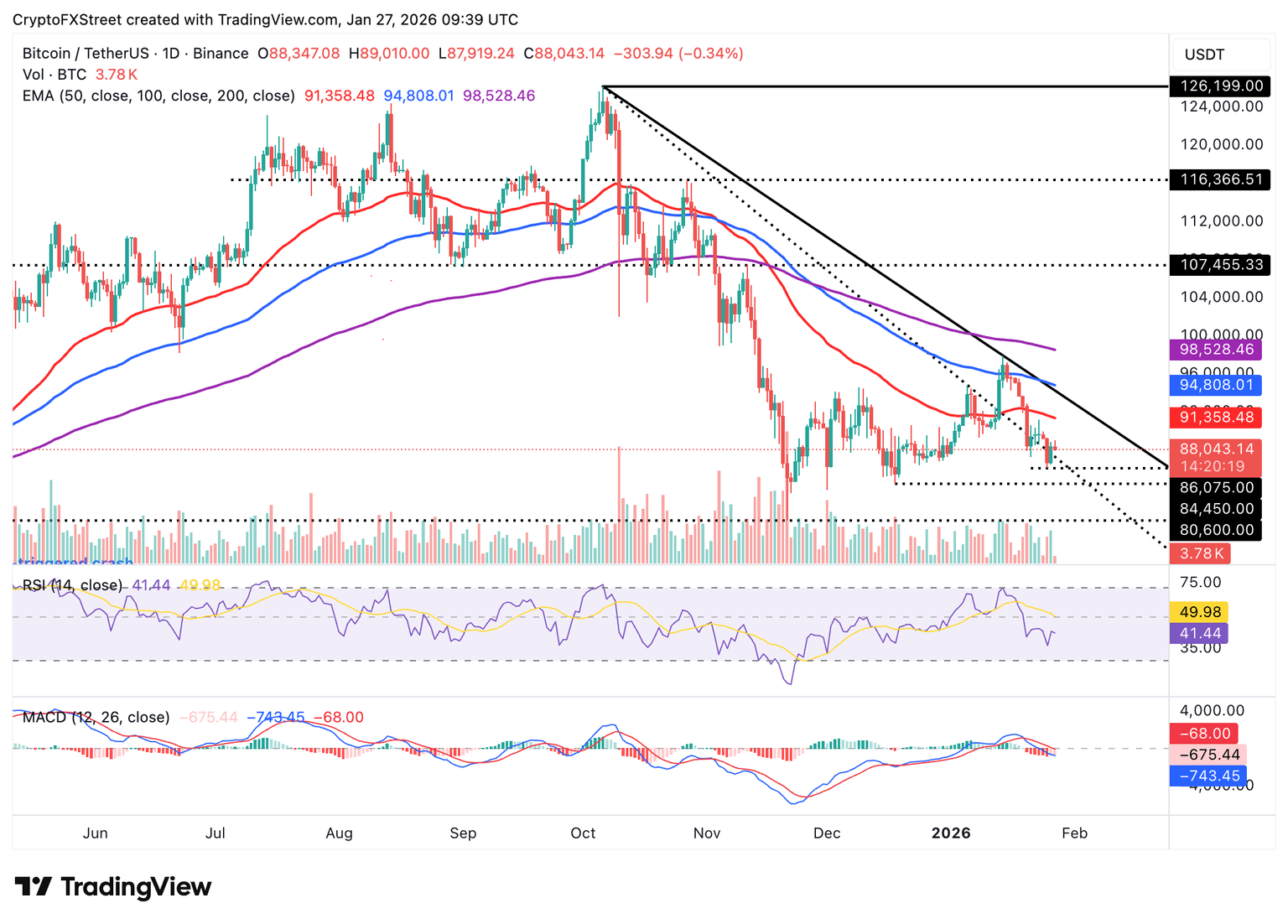 The RSI sits at 41 on the daily chart, heading toward oversold territory, as bearish momentum builds. The MACD line further reinforces the bearish outlook on the same chart, as it remains below the signal line.