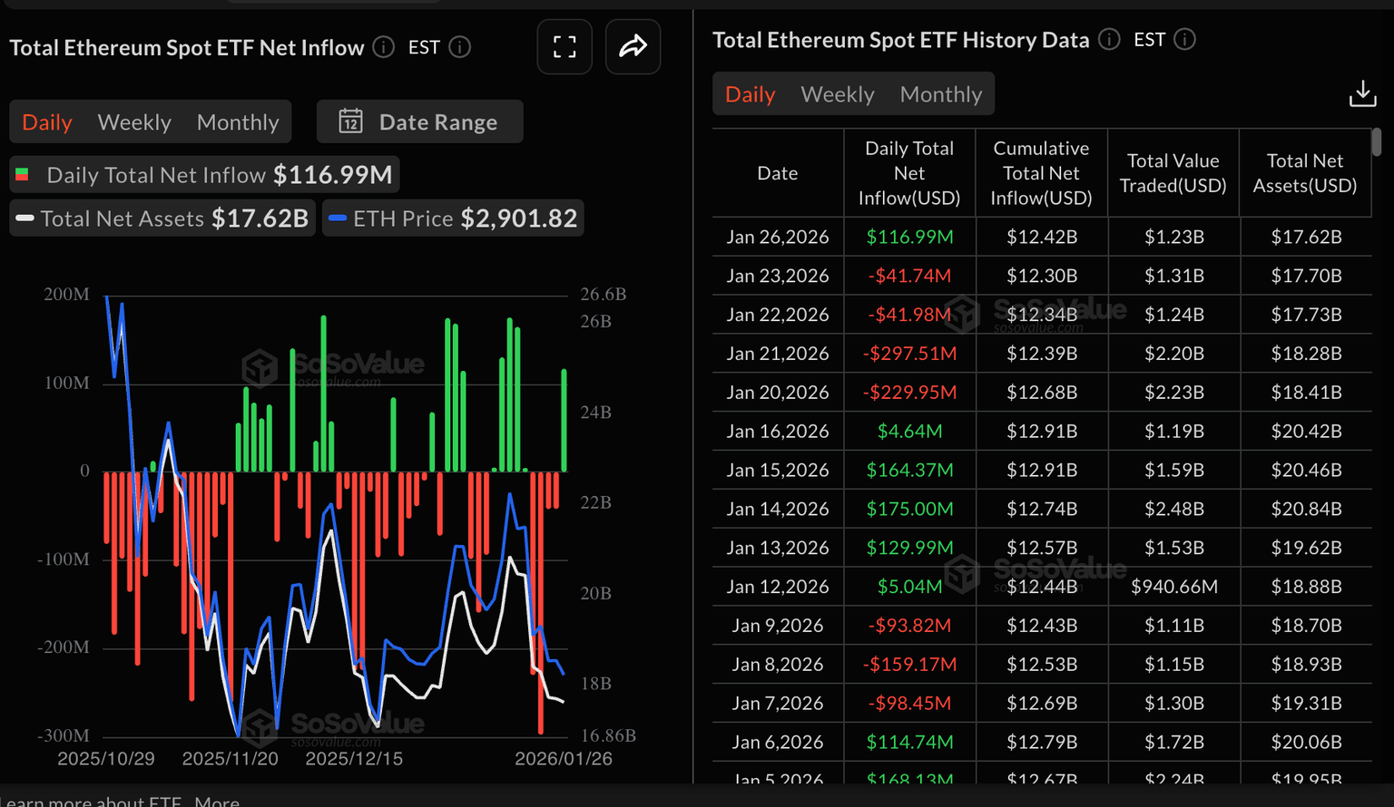 Ethereum ETFs outperformed on Monday, with net inflows of about $117 million. The surge in demand for ETH spot ETFs followed four consecutive days of outflows, bringing the cumulative total inflow to $12.42 billion and the assets under management (AUM) to $17.62 billion.